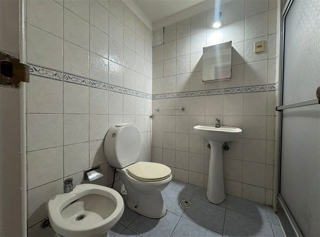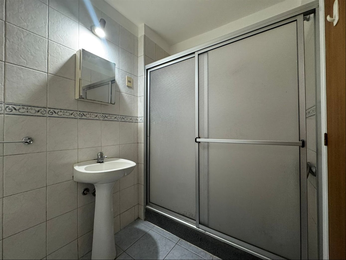 Baño grande con mampara en la ducha y conexión para lavarropas.